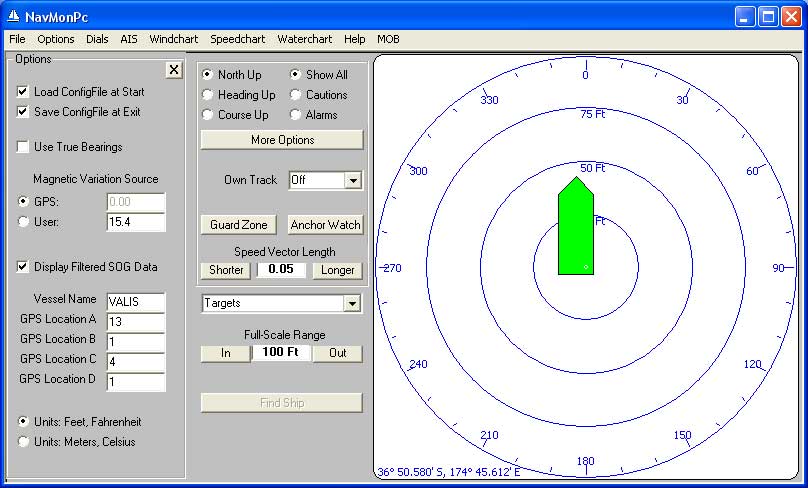 When you run NavMonPc, it will first try to read the configuration file "NavMonConfig.txt" If this file does not exist, or if it is not in the proper format, NavMonPc will start in a default configuration. When shut down, NavMonPc will save its current configuration, overwriting "NavMonConfig.txt". It is possible to read an alternate configuration file, or save the current configuration to a different file, through the File/Get Config and File/Save Config menubar selections.