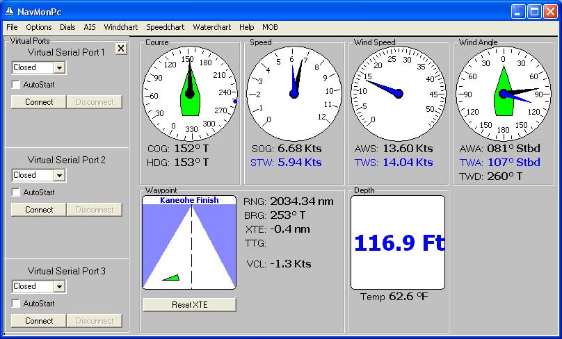 Finally, all received NMEA data can be echoed to as many as three "virtual ports". These ports are available to other programs (a charting program, for example):