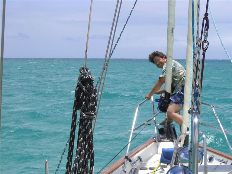 Aaron watching for coral heads (and sea turtles) as we depart Kaneohe Bay